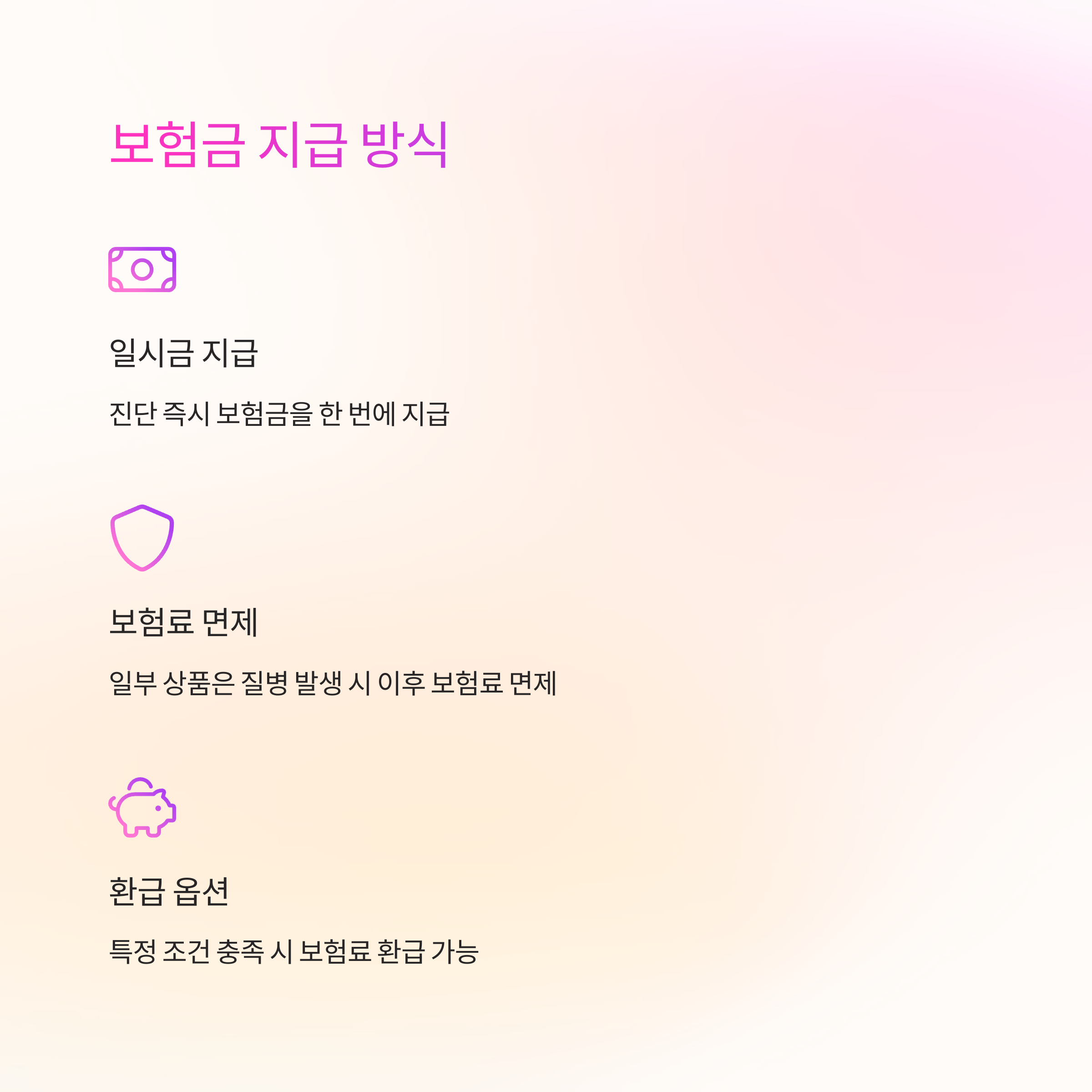이러한 상품의 주요 장점은 일시금 지급 방식인데, 진단 즉시 치료비로 사용할 수 있어 긴급한 경제적 부담을 줄이는 데 큰 역할을 합니다.